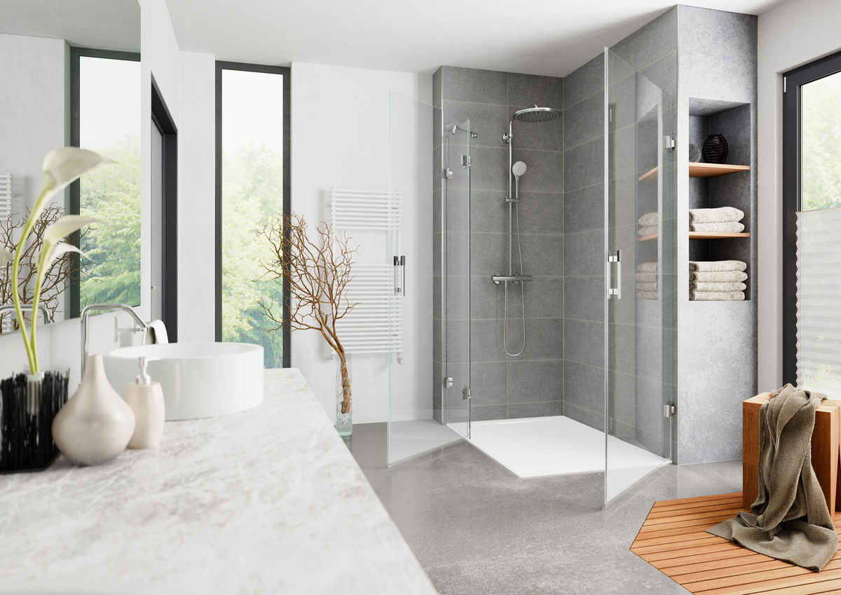 Echtglas-Pendeltüren (ohne Festteil) und Seitenwände zum Einbau als Eckabtrennung, mit Pendelscharnier oder Wandwinkel zur Wandbefestigung. Geeignet für den barrierefreien Duschbereich oder zur Montage auf Wanne.